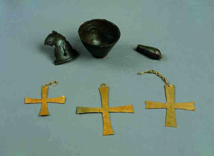 Aparecidas hacia 1920, de modo fortuito, este importante conjunto arqueológico está formando por tres cruces de láminas de oro, (dos de ellas con sus correspondientes cadenillas de suspensión), un recipiente de bronce, un vástago del mismo metal y un fragmento indeterminado, tal vez parten de una campanilla. Este hallazgo constituye uno de los más destacados conjuntos de orfebrería visigoda en la Península Ibérica (S. VII - VII d.C.). Entregado por su hallador D. Vicente Fernández "Patadicas", actualmente se custodia en el Museo Provincial de Zamora.