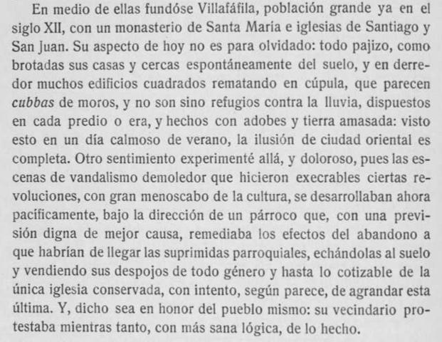 Nos deja constancia el historiador D. Manuel Gómez Moreno en su “Catálogo monumental de la provincia de Zamora” 1927, publica la siguiente reseña referida a Villafáfila, lugar que visitó en el año 1903 y que le causó unos sentimientos que permanecían en su ánimo cuando redactó el libro: “Su aspecto de hoy no es para olvidarlo: todo pajizo, como brotadas sus casas y cercas espontáneamente del suelo, y en derredor muchos edificios cuadrados rematados en cúpula, que parecen cubas de moros, y no son sino refugios contra la lluvia, dispuestos en cada predio o era, y hechos con adobes y tierra amasada: visto esto en un día calmoso de verano, la ilusión de ciudad oriental es completa. Otro sentimiento experimenté allá, y doloroso pues las escenas de vandalismo demoledor que hicieron execrables ciertas revoluciones, con gran menoscabo de la cultura, se desarrollaban ahora pacíficamente, bajo la dirección de un párroco que, con una previsión digna de mejor causa, remediaba los efectos del abandono a que habrían de llegar las suprimidas parroquiales, echándolas al suelo y vendiendo sus despojos de todo género y hasta lo cotizable de la única iglesia conservada, con intento, según parece de agrandar esta última. Y, dicho sea en honor del pueblo mismo: su vecindario protestaba mientras tanto, con más sana lógica, de lo hecho.”[21].