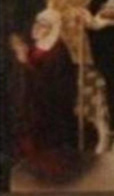 IV MUERTE El santo muerto aparece en posición inclinada, sostenido por otro ermitaño que le saca de su lecho, y contemplado por un demonio alado, que huye sosteniendo una nube. La escena es observada por unos personajes sorprendidos, con expresión venerativa, vestidos con noble indumentaria, propia de la época. El primero de ellos -más destacado- lleva un largo manto plegado longitudinalmente, que deja ver la saya y unas calzas rojas que terminan cubiertas por botas altas, según el vestido masculino de entonces. En el fondo se dibuja el lecho, en forma de caja, la iglesia gótica y una ciudad amurallada, con su puerta defendida por dos altas torres en cúpula. La escena representa la muerte de san Antonio Abad con la veneración de los creyentes.