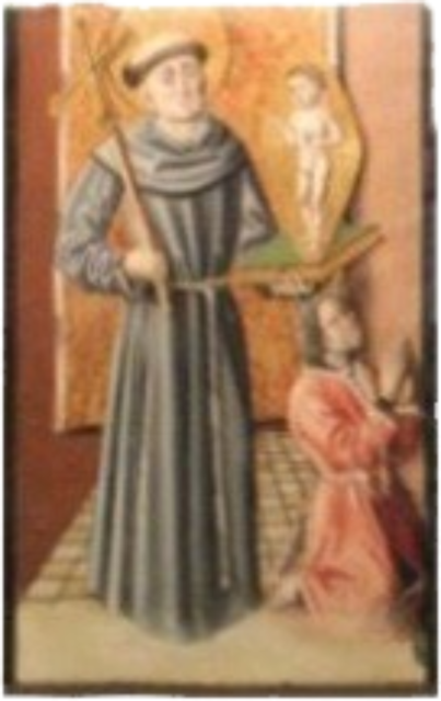 1º izquierda: San Francisco y Santos Antonio Los dos santos cubiertos con sayales, San Francisco recibiendo los estigmas, y San Antonio con un donante.