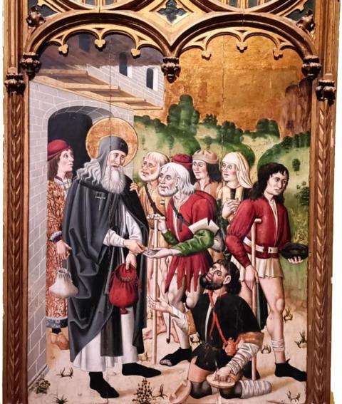 Cuatro tablas de cuerpo Las cuatro mayores representan a San Antonio repartiendo limosna, las tentaciones del santo, con su tortura y apaleamiento por los demonios y su entierro. Miden 100 x 80 cm. y se encuentran enmarcadas bajo chambranas góticas. En las tablas del cuerpo, enmarquetadas en madera con estilo gótico, aparece el santo coronado con nimbo dorado, vestimenta con túnica de color claro, escapulario y manto oscuro, que cae en pliegues verticales, excepto cuando la posición del santo lo impide. Son las vestiduras de un ermitaño. No representan perspectiva y para dar la sensación de ésta se acude a la diferente posición de los personajes que en las tablas intervienen; por ello, el santo siempre va colocado en primer lugar. En tres de sus cuatro cuadros se pintan sencillas iglesias góticas, con puertas y ventanas bajo arco conopial y espadaña con campana. El resto del paisaje es muy simple: simulación de arboledas y espacios rocosos, por ejemplo, para sin individualizar sus componentes. Sus figuras, en algunas tablas muestran malformaciones y rostros feos con expresiones toscas y grotescas, inocentes en sus composiciones, pero duras. I VIDA Representa al santo dando limosna a diversos personajes: cojos y tullidos, que se apoyan en muletas yacen en el suelo. En disconformidad, los rostros de estos son normales e igualmente sus vestiduras. En el fondo aparece la puerta de un aposento elevado, seguido de una arboleda oscura. La escena representa la vida del santo dedicada al socorro de los necesitados.