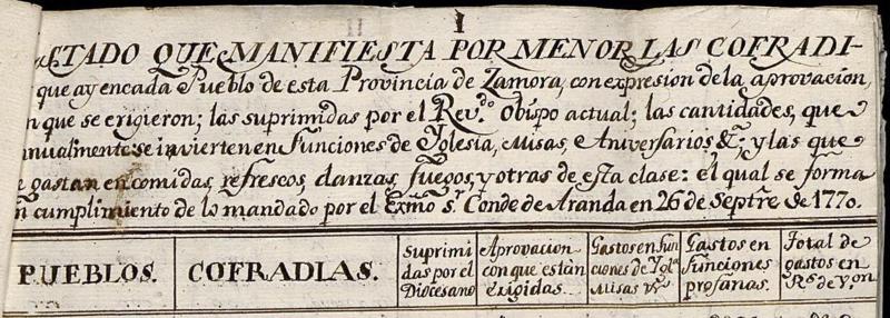 Archivo Pares: ES.28079.AHN//CONSEJOS,7098,Exp.29. Expediente de remisión del vizconde de Valoria, intendente de Zamora, al conde de Aranda del estado de las congregaciones, cofradías y hermandades que hay en los pueblos de su jurisdicción. http://pares.mcu.es/ParesBusquedas20/catalogo/description/6846186?nm http://pares.mcu.es/ParesBusquedas20/ViewImage.do?accion=42&txt_transformacion=0&txt_id_imagen=9&txt_rotar=0&txt_contraste=0&dbCode=40189472 http://pares.mcu.es/ParesBusquedas20/ViewImage.do?accion=42&txt_transformacion=0&txt_id_imagen=16&txt_rotar=0&txt_contraste=0&dbCode=40189479
