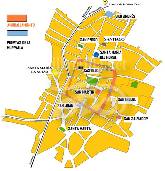Citación La referencia más antigua a la Vera Cruz es de forma indirecta de 1490, pues en la escritura de gasto que se hizo en la testamentaría de Yván de Collantes, que: “Fallesçio a sabado treçe dias del mes de hebrero de 1490”[1], figura el cumplimiento de una manda testamentaria de este hidalgo, que había sido alcaide de la fortaleza de Villafáfila: “se dio a la Vera Crus + çien mrs. Que levo Rodrigo Herrada, abad”[2]. Con lo que nos da que ya existiera anteriormente la ermita como su cofradía. La existencia de la ermita también la conocemos concretamente pues en 1513, cuando falleció la viuda de Collantes, María Vázquez, deja mandado en su testamento: “A la Vera Cruz e a Sª Mª de Villarigo e a Sª Mª Madalena e a Sª Marta e a Sª Mª la Nueva, hermitas desta villa, a cada una medio real para sus obras”[3], Por lo que es de suponer que el origen de las mismas se remonte a la Edad Media Pertenencia Esta ermita pertenecía a la jurisdicción de la iglesia de San Andrés, esta iglesia hoy día convertida en el llamado Cementerio Viejo, cerca de cuya iglesia se encontraba la ermita.