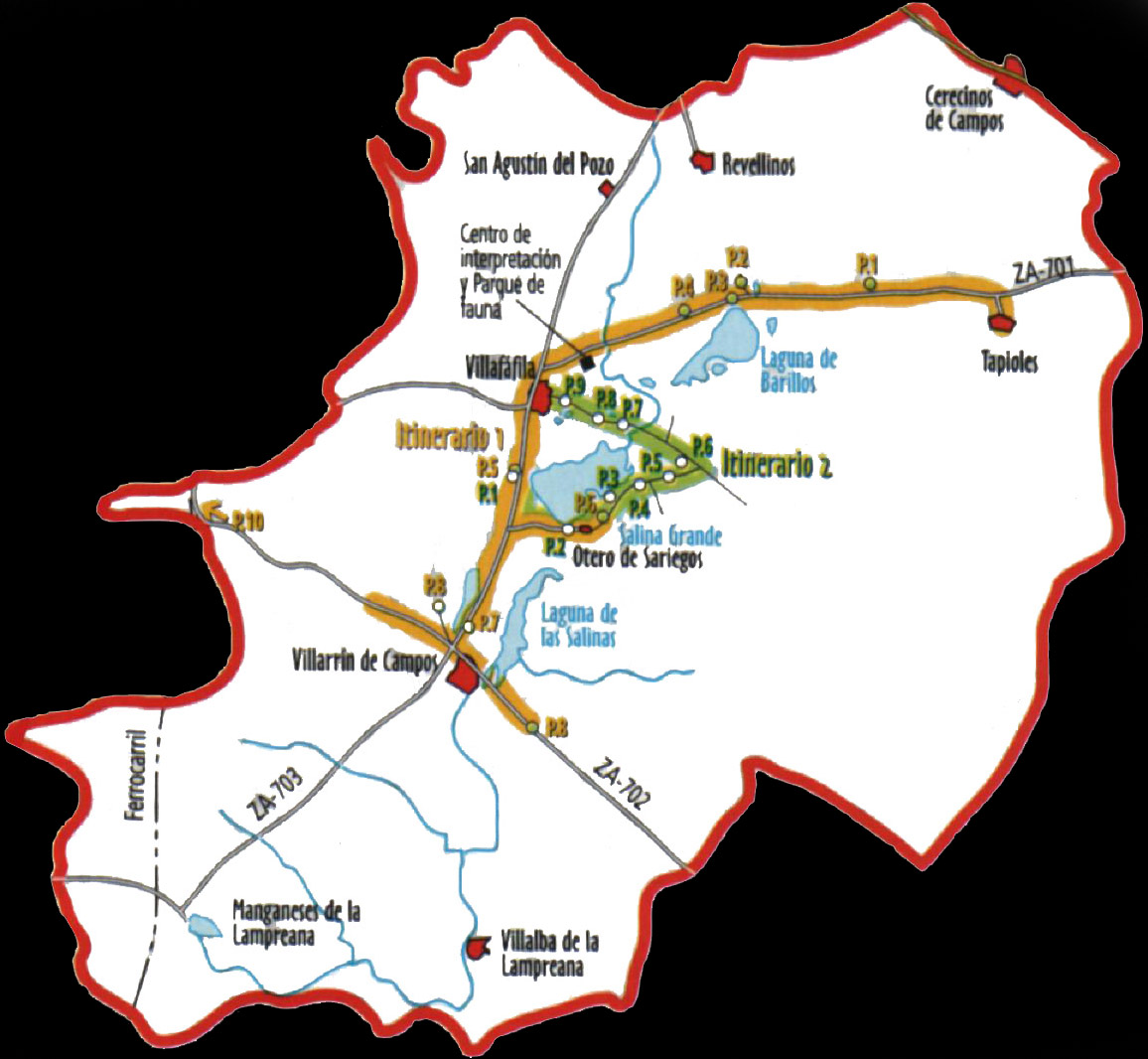 Mirador-Apartadero de la Laguna de Barrillos. Ubicado en la carretera ZA-715 punto km 11, dirección Villafáfila a Villalpando, en el término de Revellinos. RECOMENDACIONES Sigan los consejos que se detallan a continuación por el bien de la fauna, la flora, sus habitantes y para una mejor observación: Respeten la propiedad agraria, que es el medio de vida de la población local. Se aconseja visitar el Centro de Interpretación e informarse con anterioridad a la realización de cualquier recorrido. Los prismáticos son imprescindibles para la observación de aves, la utilización de guías de campo facilita la identificación de los animales. Respeten las señales, los itinerarios y las zonas de acceso prohibido. Observen y fotografíen desde los lugares señalados. Se prohíbe toda actividad que pueda afectar a la flora, fauna y no está permitido la recolección de especies de animales o vegetales, ni vivas, ni muertas. No tiren papeles ni desperdicios al suelo. Dejen los terrenos limpios. Las mejores horas de observación de aves son las primeras y últimas de luz de invierno y primavera. Durante el invierno lleven ropa de abrigo. MAPAS Hojas números 308, 319, 340 y 341 (1: 50.000) del Servicio Geográfico del Ejército y del I.G.M. INFORMACIÓN En Villafáfila en el Centro de Interpretación. 980 58 60 46. Ctra. Villalpando, Km. 1,5. 49136. Villafáfila. Zamora. cp.villafafila@patrimonionatural.org ALOJAMIENTO Casa Rural El Rincón de la Villa. Villafáfila. 980 59 19 42. Hostal Restaurante los Ángeles. Villafáfila. 980 59 19 29. Casa Rual Baltasar Lobo. Cerecinos de Campos. 980 66 90 57. Casa turismo Rural Alvada. Villarrín de Campos. 649 45 62 29. Casa Rural Laguna del Villardón. Villarrín de Campos. 630 06 98 65. Casa Rural la Huerta El Tordo. Manganeses de la Lampreana. 980 58 90 80. Casa Rural La Paloma. Manganeses de la Lampreana. 625 51 54 28. La Casa del Pueblo. Manganeses de la Lampreana. 655 82 18 99. Altejo. Manganeses de la Lampreana. 980 58 90 10. Casa Rural Los Chariles. Manganeses de la Lampreana. 646 27 37 69. Casa Pintas. Villalba de la Lampreana. 607 95 22 61 COMER Degustación El Palomar. Villafáfila. 980 59 18 61. Mesón La Panera. Cerecinos de Campos. 980 66 90 91. Mesón Prigar. Villarrín de Campos. 722 76 42 98. Bar JB - Altejo. Manganeses de la Lampreana. 980 58 90 10. TAPETEO Degustación El Palomar. Villafáfila. 980 59 18 61 Mesón las Lagunas. Villafáfila 980 59 19 42. Hostal Restaurante los Ángeles. Villafáfila. 980 59 19 29. Bar la Loma. Villafáfila. Mesón La Panera. Cerecinos de Campos. 980 66 90 91. ROMAYNA Bar de Tapas. Revellinos. 980 66 56 73. Bar el Frontón. Revellinos. 980 66 55 07. Mesón La Panera. Cerecinos de Campos. 980 66 90 91. Mesón Prigar. Villarrín de Campos. 722 76 42 98. Bar Cantina el Aire. Villarrín de Campos. Bar MM. Villarrín de Campos. Bar JB. Manganeses de la Lampreana. 980 58 90 10. Bar La Arboleda. San Agustín del Pozo. 666 39 27 86. Autor: José Luis Domínguez Martínez.