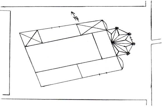 “La visité en el otoño de 1903, cuando iban derribándola, y ya destechada. Es toda de ladrillo; consta de tres naves, sobresaliendo de ellas, en medio de la cabecera un ábside semidecagonal, con estribos y cubierto con una bóveda de seis nervios en abanico, sin formas y arrancando de repisas. El arco toral es agudo y con chaflanes, lo mismo que los susodichos nervios; además, a lo largo de la cornisa corría una inscripción pintada en letras góticas de tiempo de los Reyes Católicos, pero su fecha aparecía cubierta de cal, y también persistían vestigios de imágenes pintadas en los lunetos.