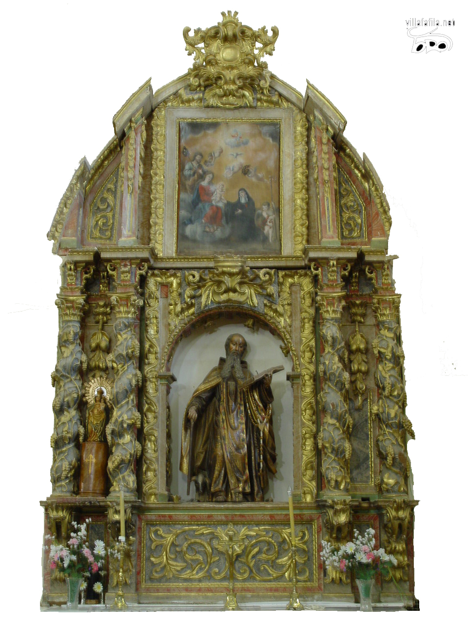Retablo de Santa Lucía, de estilo barroco prechurrigueresco. Siglo XVII, 1699[16]. Es conocido con el nombre de "San Antón" o de "San Antonio Abad". Medida de 4 x 2,5 m. Su autor es el benaventano Francisco Díez: "Doscientos reales que se dieron a Don Francisco Díez escultor vº de Benavente por cuenta del retablo que está haciendo para Santa Lucía" en 1698[17]. El retablo fue terminado en el año siguiente, pues en las cuentas de 1699 se consignan dos partidas para gastos: una para acabar de pagarlo "mas da por descargo de doscientos treinta y siete reales y medio que se dieron a Francisco Díez vº de Benavente, con el que se acabó de pagar el retablo que se hizo para Santa Lucía"; la otra para " ir por el retablo a Benavente".[18] Presenta este retablo, en sentido vertical tres partes, banco, cuerpo y ático. El banco lleva cuatro grandes repisas o cartelas, basamento de las columnas del cuerpo, que le dividen, en sentido horizontal, en tres zonas: dos laterales pequeñas y una mayor central. Esta se presenta como un espacio plano recubierto de filigranas. El cuerpo, el más importante, lleva cuatro grandes columnas salomónicas de cinco espiras, a distinto nivel horizontal, con abundante decoración de racimos de uva y retorcidos tallos de hojarascas, y flores (típico Churriguera), terminadas en capiteles corintios y estiletes decorados, que soportan los "machones" del ático. El paño central se encuentra una grande y profunda hornacina, de arco de medio punto, que contiene la imagen de San Antonio Abad, rodeada por un marco saliente que en la parte superior se quiebra, dando lugar a las nominadas "orejas", "codillo" y "tanganillo", formando un astrólogo de piedras y gallones. En el centro, sobre el marco, se desarrolla una gran cornucopia. Entre las columnas laterales a cada lado, a distinto nivel horizontal, lleva unos espacios lisos, transversales cortados por bandas inclinadas, sobre las cuales hay unos apliques colgadizos de abultados frutos. El ático está constituido por cuatro "machones" desiguales que se apoyan sobre los estipites de las columnas, (diferencia de los retablos Churriguerescos, que llevan aquí también columnas salomónicas[19], de los cuales los más centrales se adoran con pequeños "festones" (generalizados desde mediados del siglo XVII). Estos "machones" siguiendo el orden del cuerpo, dan origen a tres espacios de los cuales en el central lleva una pintura, al óleo, que representa a San José y a la Virgen entregando al Niño Jesús al anciano Simeón, por inspiración del Espíritu Santo, bajo la forma de paloma. Los espacios laterales llevan adornos consistentes en frutos y hojarasca. La pintura va orlada y rematada por una gran cornucopia. Este ático va rodeado por un arco de tipo ojival plagado de rocalla. Los "machones" van cubiertos por sobresalientes cornisas o guardapolvos. Todo el retablo está dorado en su mayor parte mientras el resto, para favorecer las reverberaciones luminosas, presentan coloraciones rojas y azules (capiteles y cartelas). En esta policromía se repite en los demás retablos barrocos que a continuación señalamos, lo que hace innecesario señalarlo.