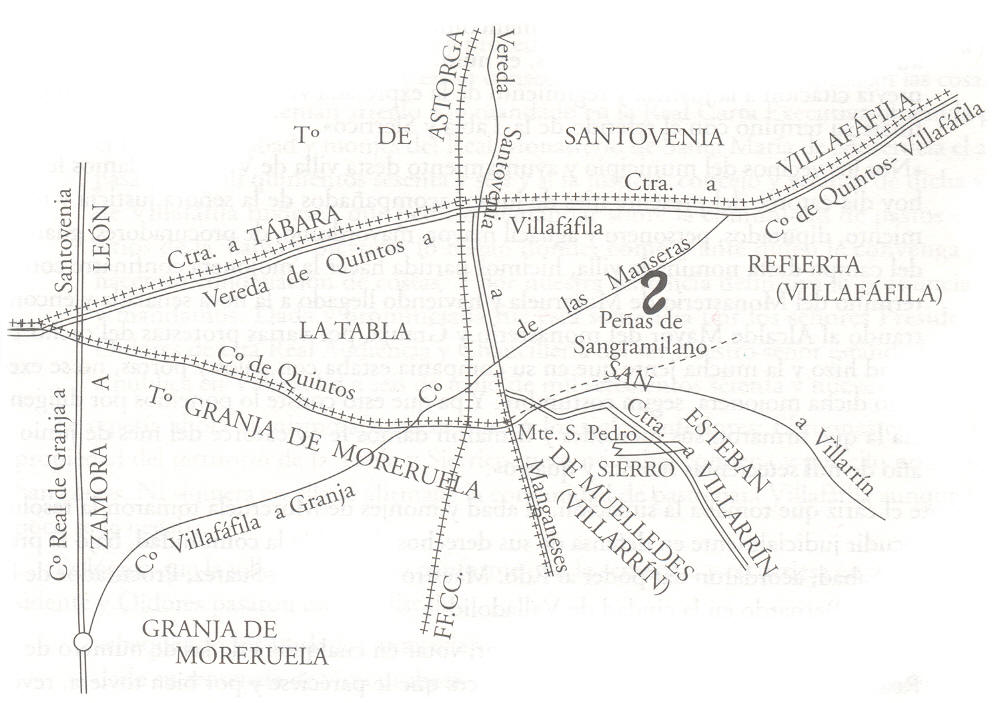 Los de Villarrín sí acuden y proceden a iniciar la mojonera desde el Canto de Muélledes y prosiguieron haciendo la mojonera entre Muélledes y La Recierta con La Tabla: “hasta llegar a la raya de Benavente al camino que biene de la Jana de Villafáfila que es adonde haze un picaño el camyno que viene de Villafáfila por el termino de Muélledes y sale al camino de La Jana que va para Santo Andrés”. La justicia de Benavente no se presentó a hacer la mojonera, a pesar de estar citada, y el alcalde de Moreruela procedió a hacer el recorrido en solitario, no hallando mojón ninguno en el camino de La Jana a San Andrés hasta acabar La Tabla en el camino que llevan los de Otero para las aceñas de San Andrés. Además del término de La Tabla, existía otra porción de término denominada El Sierrico, en el que también los ganados de Villafáfila tenían comunidad de pastos. No lo he encontrado mencionado en documentación anterior al siglo XVI, pero por un apeo de 1721 se localiza al oeste de Valdelayegua, contra el río Esla, hasta el camino de Moreruela a Bretó, coincidiendo con el límite señalado en el documento de 1256, por el que se autoriza a los ganados de Villafáfila a pastar en parte de los antiguos montes de Sahagún. Los amojonamientos que se realizaban entre las villas de Benavente y Villafáfila se hacían con participación de alcaldes y regidores de ambas villas, a veces con presencia de los corregidores respectivos, siempre cada uno por su término con sus varas de justicia levantadas, con asistencia de dos escribanos y con la participación de algunos vecinos de las aldeas. Tenemos noticias de varios de ellos, el más antiguo de los que se han conservado es de 1525: “En el termyno que dizen Terdehuso ques entre los termynos de la villa de Benavente e lavilla de Villafáfila a veynte e syete dias del mes de ebrero año del nasçimyento de Nro Salvador Ihuxpo de myll e quinyentos e veynte e çinco años, estando los señores Pedro de los Rios e Hernan Charro regidores de la villa de Benavente por parte de la dicha villa, e estando ay presente el señor Bachiller Represa alcalde mayor de la villa de Villafáfila, e Alonso Glez regidor, e Alonso Hernández, alcalde ordinario por parte de la dicha villa, e Frcº de Caramaçana, procurador de la dicha villa, para alzar los termynos siguyentes, en presençia de los dichos señores e por ante my Diego Glez, escribano e notario publico de sus magestadesen la su corte e en todos los sus reynos e señorios e uno de los doze escribanos publicos del numero de la villa de Benavente, por el muy ilustre señor don Alonso Pemyntel, conde de la dicha villa e de los testigos de yuso escritos”. En estos amojonamientos nunca se hallaban presentes ningún fraile ni representante del monasterio de Moreruela, a pesar de incluir la raya de La Tabla: “e de alli fueron el derecho azia arriba e alzaron otro mojon en cabo del termino de Valle, par del camino que va de Villafáfila a las azeñas de Quintos, e de alli fueron por el camino Ancho azia abaxo e alzaron otro mojon que dizen el camino de la Refierta e de Quintos, e de alli fueron la cañada de la Tabla arriba, en linde de la dicha cañada, e termino de Valle e alzaron otro mojon, e de alli fueron por la dicha cañada adelante, par del camyno que va de Villafáfila a la Granja e alzaron otro mojon e de alli fueron por el dicho camino adelante asta el Pico de la Tabla a la Punta Alta e alli se dio el dicho camyno por termyno, el qual va para la barca e Piélago de Moncorvo e asta Villafáfila, e alli en el dicho camino no se hizo mojon porque nunca se hallo aver estado hecho”. En ese primer amojonamiento que conocemos la mojonera la terminaban en el pico de La Tabla, sin incluir El Sierrico. En la siguiente mojonera que se conserva, realizada en 1548, perteneciendo ya la villa de Villafáfila a don Bernardino Pimentel, con la participación de los corregidores, de Benavente, Licenciado Gonzalo Pérez, nombrado por el Conde, y de Villafáfila, Antonio García de Montalvo, nombrado por el nuevo señor de la villa, se llega amojonando hasta El Sierrico: “LXXII. y de alli fueron todo el camyno viejo adelante hasta do dizen la Laguna de Santa Marta, y de alli por el dicho camyno adelante fueron hasta llegar al pico de La Tabla a la Punta Alta y queda todo el dicho camyno por comun entrambas partes, y de alli todo el camino adelante hasta llegar al Sierrico que dicen, a la encrucijada de los camynos, el uno que va hazia el Piélago de Mancorvo y el otro de las Carretas que va del monesterio a las aceñas de Quintos, e alli acabaron el dicho apeo, vesita e amojonamyento”. Durante los años del pleito anterior se realizan otras varias mojoneras, entre Benavente y Villafáfila en 1551, 1554, 1558, 1563, 1570 y 1581, y en ninguna se hallan presentes los monjes y en todas ellas se llega amojonando hasta el Sierrico, de lo que se deduce un reconocimiento por parte del concejo de Benavente de la jurisdicción del de Villafáfila sobre el término de La Tabla. La situación siguió en un impasse y la justicia de Villafáfila procedía en La Tabla como antes de la ejecutoria de 1566, entrando con vara alta y haciendo amojonamientos y prendando los ganados foráneos que encontraban paciendo, lo que provocaba las quejas de los monjes. En 1620 Fray Ángel Guerrero, en nombre del monasterio, volvió a requerir a la justicia de Villafáfila para que: “no entren ni manden entrar en el termino de La Tabla con vara alta de justª nni andar por el con ella en ninguna maneran ni amojonen ni hagan amojonar el dicho termino con su autoridad de justª, ni en ninguna otra forma, sino fuere con orden y lizencia del abad y monjes del dicho monasterio, cuya es la jurisdicion, propiedad y señorio del dicho termino, y de lo contrario hacer, protesto nulilad de todo lo que hizieren y de querellarme ante el rey nuestro señor y ante quien con derecho deba por quebrantar y ronper jurisdicion ajena”. 
