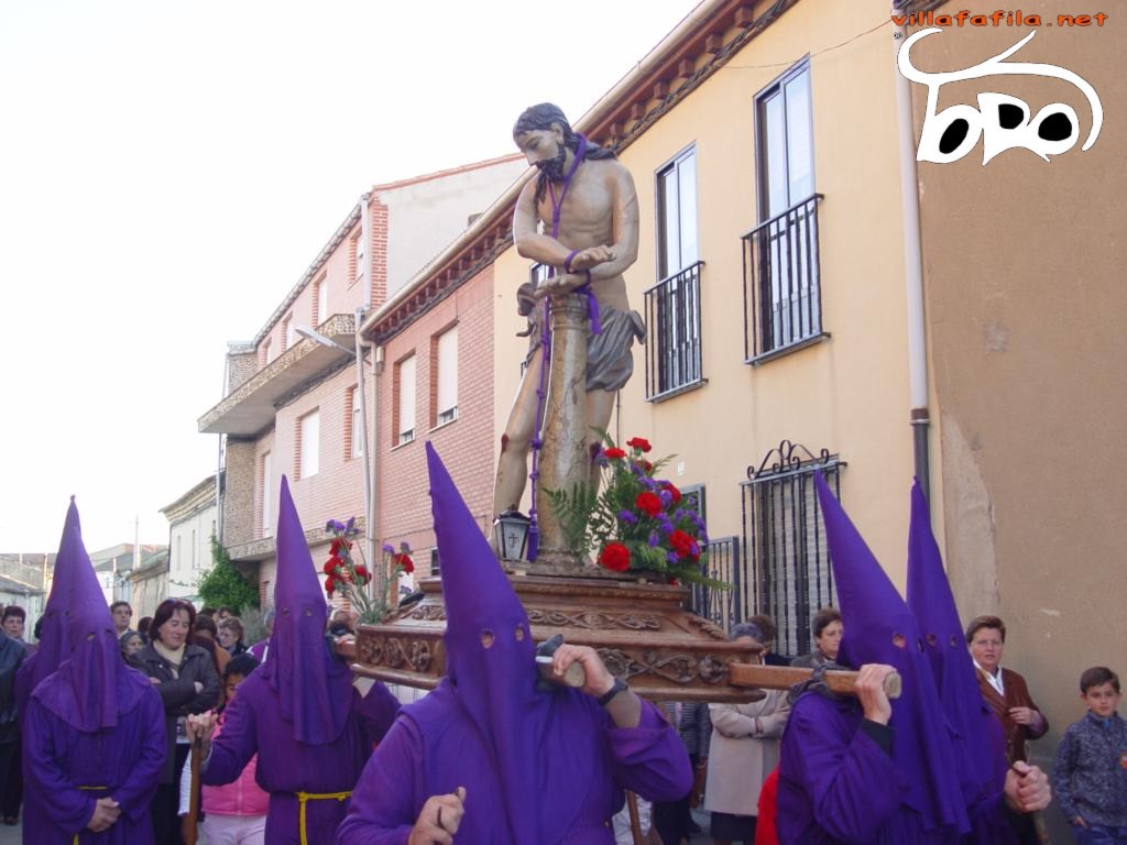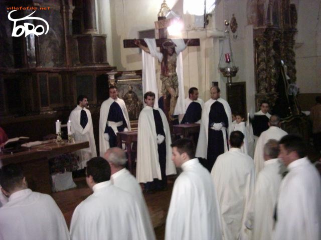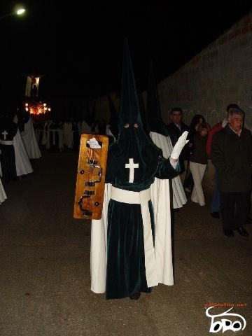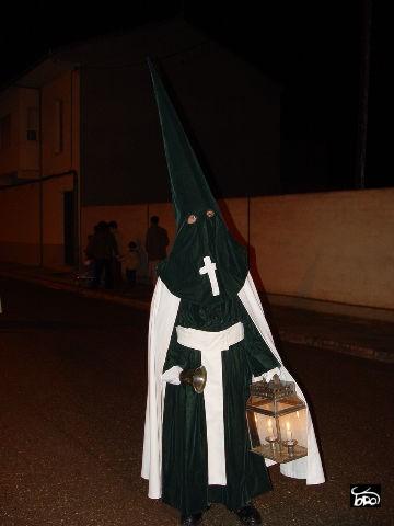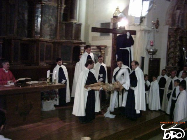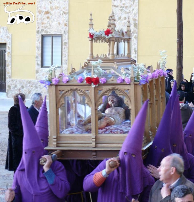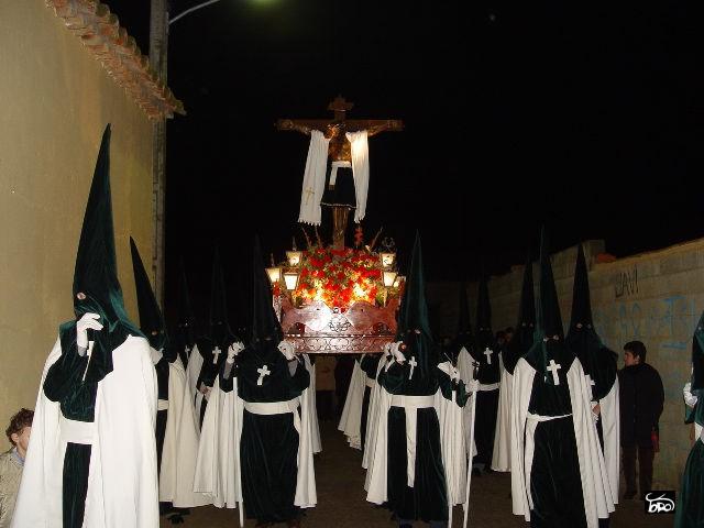 Los cofrades entran a la iglesia en dos filas , llevando una cruz, un estandarte de la Cofradía, un farol, una esquila y una matraca que hacen sonar una tras de otra con cierta pausa haciendo imperar el silencio, se ponen a cada lado del Cristo, el cura abre así las procesiones de Semana Santa, donde lee una poesía a la cofradía, toma juramento de silencio a los cofrades durante la procesión, se canta el perdona tu pueblo. Salen en procesión por las calles, que es portado por ocho personas, a mitad de recorrido en la plaza del Ayuntamiento se canta el Miserere por la gente del pueblo es uno de los momentos cumbres de esta procesión, durante todo el trayecto se va haciendo sonar la matraca y la esquila una forma de recordar que se debe ir en silencio, al finaliza la procesión dentro de la iglesia se canta el Señor Jesús Mío, luego los cofrades y la gente adoran al Cristo besando su túnica. Los cofrades tienes un refresco donde se comentan los detalles de la procesión.