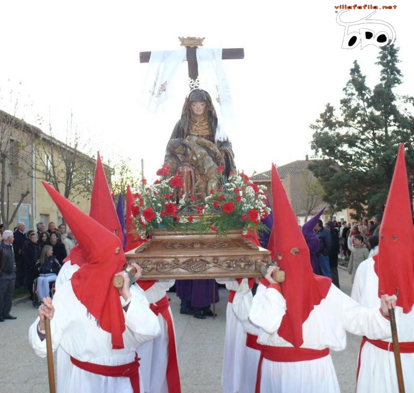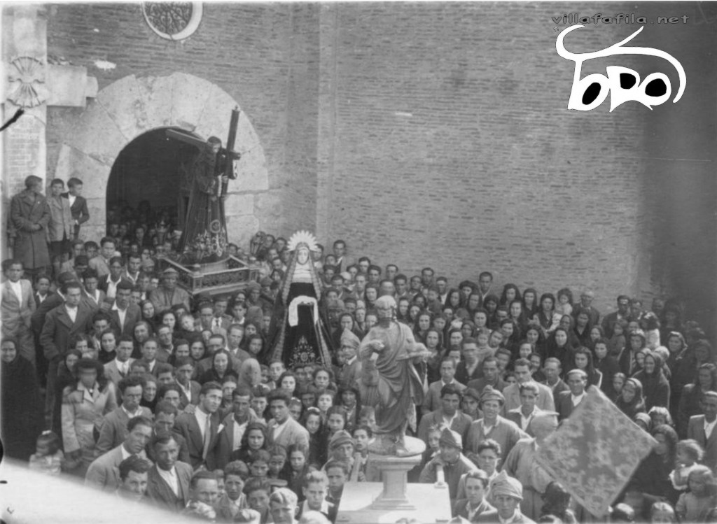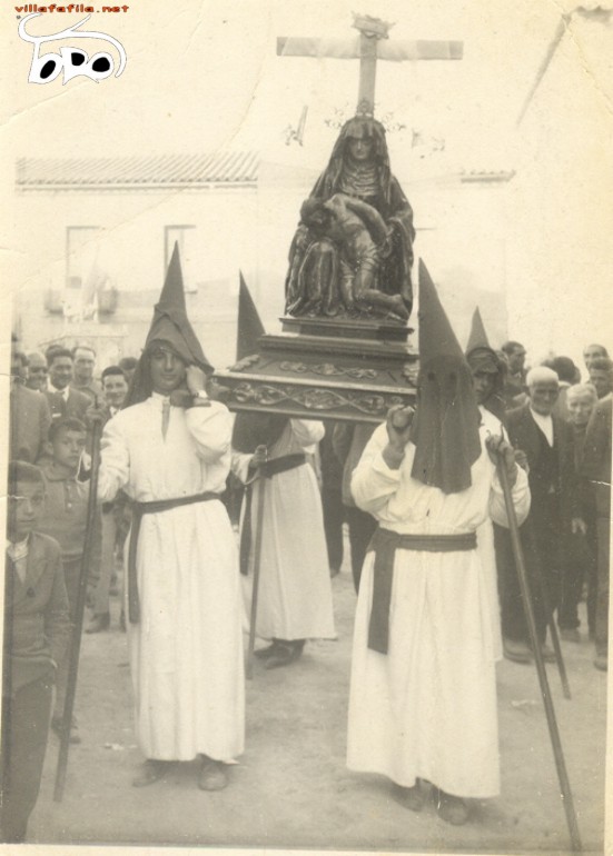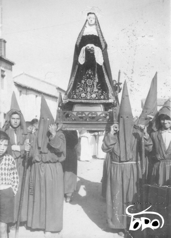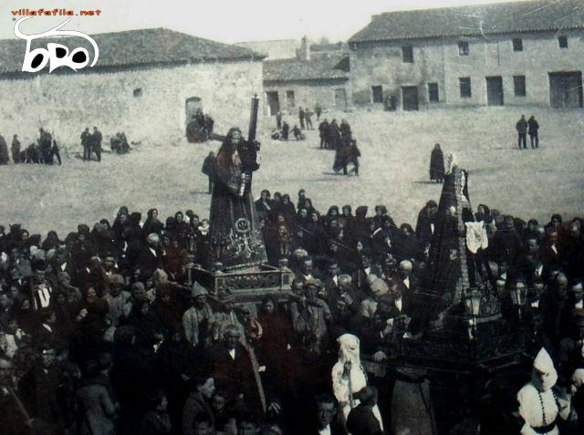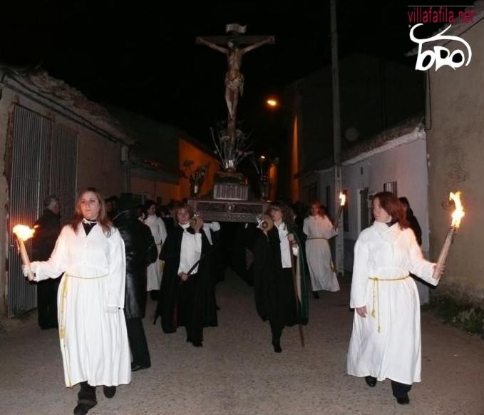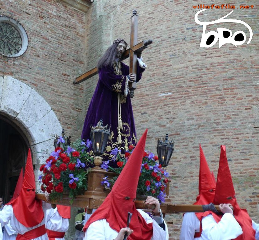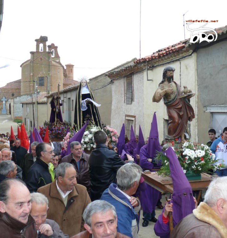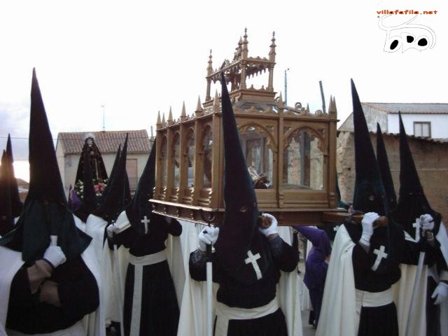 En 1673 se menciona entre los altares de San Pedro al Cristo de la Urna, es una talla con los brazos articulados, pues se utilizaba para la celebración del Descendimiento, una ceremonia de representación del desenclavamiento de Jesús de la Cruz y su traslado a la sepultura, que precedía a la procesión del Santo Entierro. Seguramente que el Descendimiento se celebre desde el siglo XVII, de ahí la factura articulada del Cristo, pero hasta mediados del XVIII no he encontrados referencias documentales. Junto con el Cristo de la Urna participaba en la representación del Descendimiento la imagen de Ntra. Sra. de la Soledad, que tiene articulada la cabeza para poder responder afirmativamente cuando le presentan los clavos, la corona y el cuerpo del Cristo. La Cofradía de la Vera Cruz, salía la noche del Jueves Santo, los cofrades eran de dos clases: la luz, y sangre, o, de disciplina. Todos iban con túnica o camisa blanca y capirote o caperuza; llevando una vela los de luz y disciplinándose los segundo durante la procesión. También había mujeres cofrades en 1717 eran 45, aunque no se especifica de que tipo. Después de la procesión se tenía un refresco consistente en <<tortas y vino>> la parva esta cofradía dejó de hacerlo hacia 1880. Los ritos y penitencias que tenían lugar durante toda la noche del Jueves Santo que hacían permanecer despiertas a gran número de personas, las cuales hacían más llevadera la vigilia con unos tragos de vino, serían el origen de la costumbre de hacer la limonada y mantenerse toda la noche de juerga que seguían los jóvenes de Villafáfila desde tiempos inmemoriales. La cofradía de Jesús Nazareno estaba radicada en la iglesia de San Martín, y debió surgir a principios del siglo XVIII. Así en 1714 en el libro de fábrica de la citada parroquia se hace un inventario de objetos litúrgicos y se mencionan: “unas andas en que sale Ntra. Sra.…unas andas en que sale Jesús Nazareno”, de donde se deduce que ya desde antes de ese año eran sacadas en procesión las imágenes de Jesús Nazareno y de María que sale en la procesión del Viernes Santo. En la visita pastoral de 1715 el obispo de Astorga aprobó “las reglas y constituciones de la cofradía que nuevamente se ha establecido en dicha iglesia (S. Martín) de Jesús de Nazareno”, La última relación que se tiene es en 1906. |