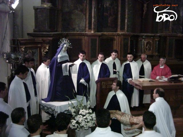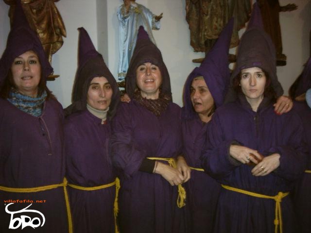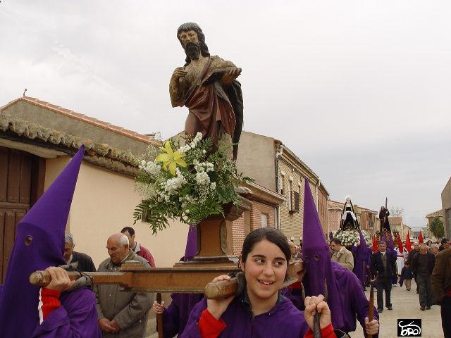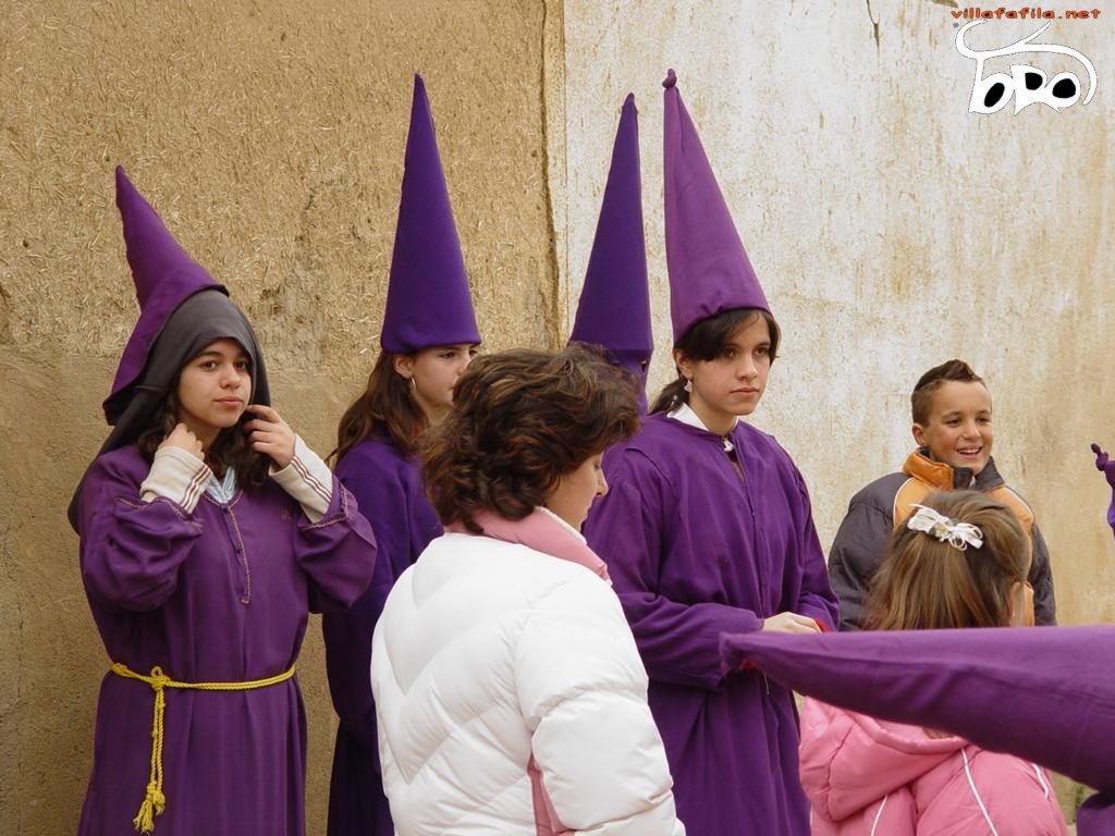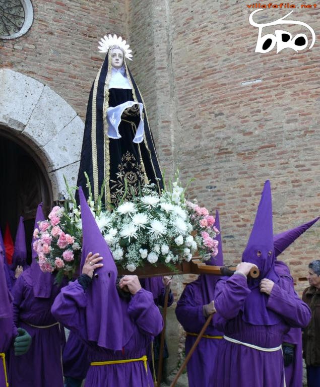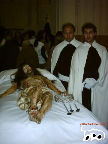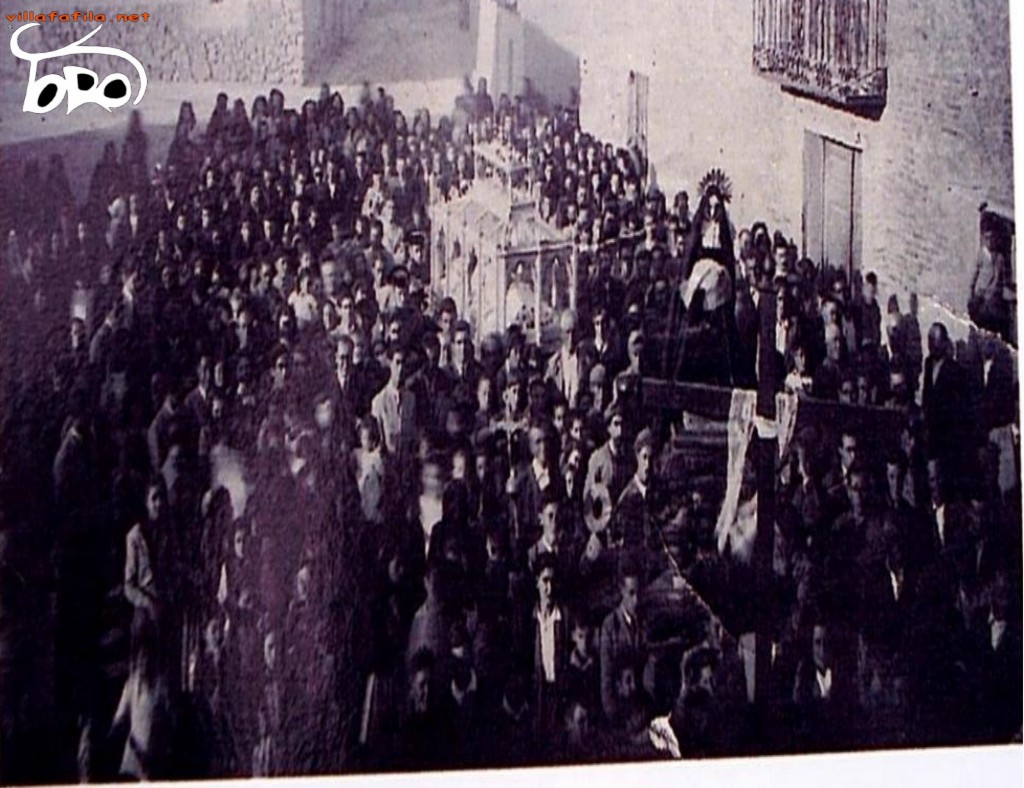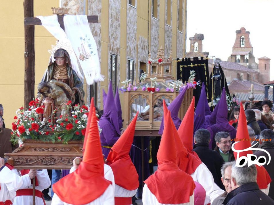 En 1673 se menciona entre los altares de San Pedro al Cristo de la Urna, es una talla con los brazos articulados, pues se utilizaba para la celebración del Descendimiento, una ceremonia de representación del desenclavamiento de Jesús de la Cruz y su traslado a la sepultura, que precedía a la procesión del Santo Entierro. Seguramente que el Descendimiento se celebre desde el siglo XVII, de ahí la factura articulada del Cristo, pero hasta mediados del XVIII no he encontrados referencias documentales. Junto con el Cristo de la Urna participaba en la representación del Descendimiento la imagen de Ntra. Sra. de la Soledad, que tiene articulada la cabeza para poder responder afirmativamente cuando le presentan los clavos, la corona y el cuerpo del Cristo. La Cofradía de la Vera Cruz, salía la noche del Jueves Santo, los cofrades eran de dos clases: la luz, y sangre, o, de disciplina. Todos iban con túnica o camisa blanca y capirote o caperuza; llevando una vela los de luz y disciplinándose los segundo durante la procesión. También había mujeres cofrades en 1717 eran 45, aunque no se especifica de que tipo. Después de la procesión se tenía un refresco consistente en <<tortas y vino>> la parva esta cofradía dejó de hacerlo hacia 1880. Los ritos y penitencias que tenían lugar durante toda la noche del Jueves Santo que hacían permanecer despiertas a gran número de personas, las cuales hacían más llevadera la vigilia con unos tragos de vino, serían el origen de la costumbre de hacer la limonada y mantenerse toda la noche de juerga que seguían los jóvenes de Villafáfila desde tiempos inmemoriales. La cofradía de Jesús Nazareno estaba radicada en la iglesia de San Martín, y debió surgir a principios del siglo XVIII. Así en 1714 en el libro de fábrica de la citada parroquia se hace un inventario de objetos litúrgicos y se mencionan: “unas andas en que sale Ntra. Sra.…unas andas en que sale Jesús Nazareno”, de donde se deduce que ya desde antes de ese año eran sacadas en procesión las imágenes de Jesús Nazareno y de María que sale en la procesión del Viernes Santo. En la visita pastoral de 1715 el obispo de Astorga aprobó “las reglas y constituciones de la cofradía que nuevamente se ha establecido en dicha iglesia (S. Martín) de Jesús de Nazareno”, La última relación que se tiene es en 1906. |