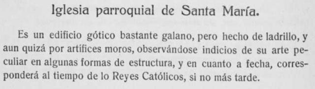 Al describir la iglesia de Santa María: “un edificio gótico bastante galano, pero hecho de ladrillo, y aun quizá por artífices moros, observándose indicios de su arte peculiar en algunas formas de estructura, y en cuanto a su fecha, corresponderá al tiempo de los Reyes Católicos, si no más tarde”[22].