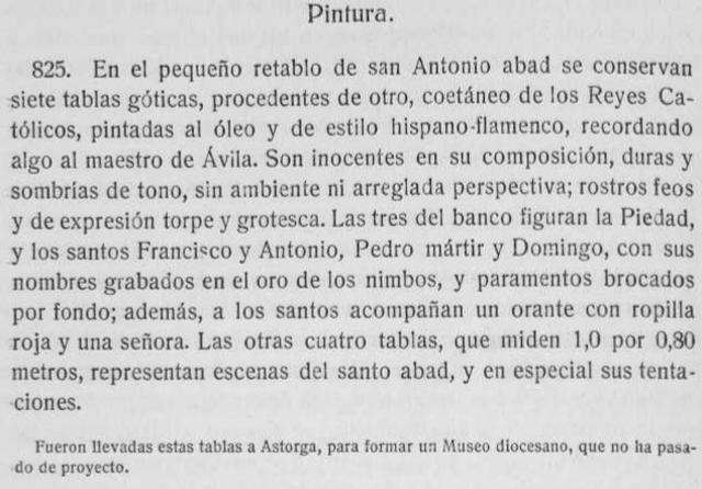 Llega a la sección Pintura donde apunta: “En el pequeño retablo de san Antonio Abad se conservan siete tablas góticas, procedentes de otro, coetáneo de los Reyes Católicos, pintadas al óleo y de estilo hispano-flamenco, recordando algo al maestro de Ávila. Son inocentes en su composición duras y sombrías de tono, sin ambiente ni arreglada perspectiva; rostros feos y de expresión torpe y grotesca. Las tres del banco figuran la Piedad, y los Santos Francisco y Antonio, Pedro mártir y Domingo, con sus nombres grabados en el oro de los nimbos, y paramentos brocados por fondo; además, a los santos acompañan un orante con ropilla roja y una señora. Las otras cuatro tablas, que miden 1,0 por 0,80 metros, representan escenas del santo abad, y en especial sus tentaciones.”. Con letra más pequeña anota, una referencia posterior. “Fueron llevadas estas tablas a Astorga, para formar un Museo diocesano, que no ha pasado de proyecto”[23].