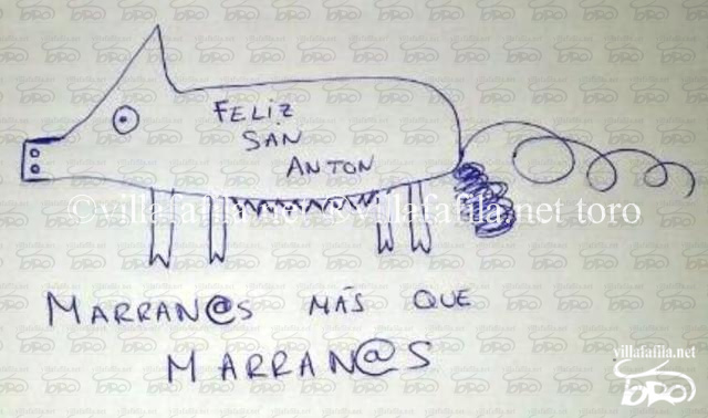Capellanía o Patronato de Legos, fundado en la parroquial de Santa María del Moral de Villafáfila, posiblemente a finales del siglo XV, y en todo caso antes de 1504, por María Fernández, viuda de Fernán Fernández, vecina de Villafáfila, de presentación de los patronos, pues desde ese año la gozaba Diego de Robles[1], arcipreste de Villafáfila. Tenía de cargo el decir 50 misas rezadas al año. Cinco familias de la villa figuraban como patronos que gozaban entre sí de una heredad de tierras y que tenían derecho de enterramiento en la capilla. Poco sabemos de los fundadores que tal vez estuvieran representados por el orante con ropilla roja y la señora representados en una de las tablas del banco. María Fernández ya figura como viuda en el padrón de 1497. Sabemos que habían sido propietarios de una explotación salinera en Villafáfila, actividad industrial, de la que participaban en el siglo XV los principales vecinos de la villa, así clérigos, pecheros o hijosdalgos, pues se documenta en 1500 a: “una María Fernández vezina de la dicha villa que tenya una cabaña e arrendaba el monte de dicho don Pedro Pimentel[2] para faser sal en ella”[3]; En los apeos de cabañas de hacer sal de 1522 y 1528 se mencionan una cabaña y varias posadas de hacer sal, que pertenecían a la capilla de San Antonio, procedentes, sin duda, de los bienes dotales de la misma. Los patronos en 1647 son Diego de Traslago Macías Martínez, Antº Simón, Salvador de Villalba y Juan Pedrero de Bretó. En 1662 Antº Simón, Salvador Villalba, Antº Martínez, Juan García, viudo de Luisa Martínez y la viuda de Diego de Treslago. A principios del siglo XVIII los derechos de patronato recaen por herencia en la familia de los Costilla, y es capellán Pedro Costilla. En 1752 figuran como bienes del patronato tenía 48 fanegas, distribuidas en 18 fincas y 1 viña (en Valdeloma), de 1/2 fanegas, que rentaban 4 cargas de pan mediano; y tenía por carga 100 misas anuales. Todavía en 1822 se mencionan a las familias que tienen a cargo el patronato: D. Teódulo Orduña. D. Gabriel Costilla, el curador del dos hijas menores de don Gaspar Costilla, recién fallecido, Alonso Gutiérrez y Manuel Castillo. Con la desamortización las tierras pasaron a la propiedad efectiva de los patronos abonando una pequeña cantidad a la Hacienda Pública. Fiestas de San Antonio Abad “San Antón”, subasta del cerdo de San Antón La fiesta de San Antonio Abad era muy celebrada en Villafáfila, como devoción de la iglesia de Santa María del Moral, con la manutención del cerdo, la costumbre de criar uno o más cerdos que se subastaban el día 17 de enero para sacar limosnas con las que sufragar los gastos de la función de ese día, que se hacía ante el altar del santo y a la puerta de Santa María donde se acudía con los animales de labor engalanados para la ocasión. Se conservan las cuentas que recibía el santo entre 1847 y 1893 de las limosnas cuyo importe resultante de la subasta se destina a sufragar los gastos de la Fundación del Santo y unos años se rifaba el cerdo y otros no, según se hubiera criado por las calles el “marrano Antón”. En las cuentas de 1821 Leemos: “Dos celemines para la manutención de una cerda de San Antonio”. Otras veces se dice “el cerdo Antón”[4]. El último año de que se tiene constancia de subasta del marrano fue en 1880 que valió 328 reales. En Villafáfila pervivía la tradición en las fiestas de San Antón, hasta los años sesenta del siglo XX, donde se celebraba con gran solemnidad la festividad de San Antonio Abad, “San Antón”, patrono de los animales. En la liturgia se bendecía a los animales ante su imagen en el día de la fiesta y se recitaban los llamados refranes de “San Antón”, que eran pequeñas rimas recitadas por la quintada del año en burro, y parodiando acontecimientos que habían ocurrido el año antes en el pueblo o al propio santo. ¡O San Antón Glorioso! que estas en esa tronera, con el ojo de cristal, y el pito de madera[5]. También era típico entre la juventud, el tirar paja a la portalada de las casas, o lo que llamamos “echar marranas”, aún entre vecinos alguna se hace dejarla a la puerta como la de la fotografía.