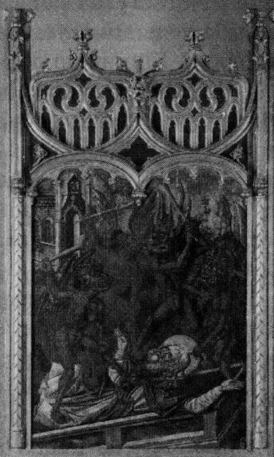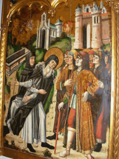 IV MUERTE El santo muerto aparece en posición inclinada, sostenido por otro ermitaño que le saca de su lecho, y contemplado por un demonio alado, que huye sosteniendo una nube. La escena es observada por unos personajes sorprendidos, con expresión venerativa, vestidos con noble indumentaria, propia de la época. El primero de ellos -más destacado- lleva un largo manto plegado longitudinalmente, que deja ver la saya y unas calzas rojas que terminan cubiertas por botas altas, según el vestido masculino de entonces. En el fondo se dibuja el lecho, en forma de caja, la iglesia gótica y una ciudad amurallada, con su puerta defendida por dos altas torres en cúpula. La escena representa la muerte de san Antonio Abad con la veneración de los creyentes.