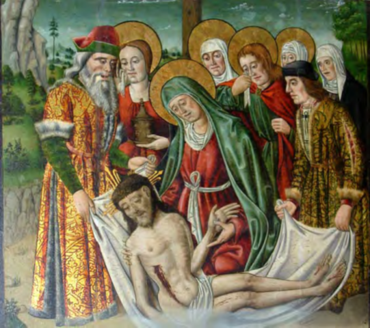 La coloración de los mantos de los personajes corresponde a colores vivos: rojos y verdes, principalmente, y grisolía, sobre todo en los del banco o predela. El maestro de Villafáfila, no sigue totalmente los estilos de Fernando Gallego y del Maestro de Ávila, Tiene aspectos propios y diferentes de ambos pintores. Presenta siempre a sus santos con las cabezas redondeadas de nimbos dorados. Sus iglesias son siempre de torres de espadaña, como las iglesias de castellanas. En otros aspectos son totalmente coincidentes, pues sus personajes, como aquellos, presentan gentes necesitadas y enfermas, así como otras con nobles vestiduras, según vestían las gentes poderosas del siglo. El Maestro de Villafáfila tiene un estilo propio, muy castellano. Desconocemos su origen, pero éste pinta a Castilla y Villafáfila, con sus torres y personajes de la época. En su favor hay decir que actualmente, limpias y restauradas, las tablas muestran mayor luminosidad y colores más vivos, pero los personajes adolecen de falta de movilidad y apenas se individualizan los rostros. Su autor tiene dificultades en la composición y en el tratamiento de la perspectiva. Parece suplir estas carencias aplicándose en algunos detalles, en el empleo de brocados para fondos y ropajes, o intentando hacer creíble los paisajes lejanos de rocas y árboles. Estamos pues ante un pintor joven con cierto oficio y estilo propio que, a falta de otros maestros más cualificados, se hizo cargo de diferentes obras para las iglesias y clientes de la comarca en la cual residía. Se trata de un pintor novel porque, años más tarde, e influido por otro artista que también trabajó en Benavente, pinta una tabla que hoy se encuentra en la iglesia de San Juan del Mercado de esa localidad donde puede apreciarse una clara mejoría en el estilo. La figura de San Antonio repartiendo limosna de Villafáfila tiene su doble en José de Arimatea, y el rostro de San Félix en la escena del apresamiento de Villalobos es idéntico al Nicodemo de Benavente. El cuerpo muerto de Cristo, pequeño en relación con el tamaño de su madre, presenta las mismas características que el yacente desnudo de la pintura del museo de Astorga y que el de San Félix arrastrado por los caballos de Villalobos. La dificultad a la hora de pintar las orejas visibles de los personajes es idéntica en los tres casos. Las melenas largas, divididas en guedejas, que sobresalen del tocado del San Antonio de Villafáfila se repiten en la Magdalena de la tabla benaventana. Son iguales las manos con dedos finos, largos y separados, que sujetan las cosas. Así, la forma en que Nicodemo coge el brazo del yacente, o la de María Magdalena sujetándole las piernas es idéntica a la del franciscano San Antonio sosteniendo el libro sobre el que está el niño Jesús del conjunto astorgano. Esta manera separada de disponer los dedos de la mano al sujetar objetos puede ser una herencia recibida del “Maestro de Villalobos”. Motivos y venta del retablo de San Antonio Abad en 1908 Con efecto indirecto de la Desamortización de Mádoz (1855), en 1896 se suprimieron las parroquias de las iglesias de San Martín de San Pedro y El Salvador quedando anejadas a la de Santa María del Moral. En 1903 se derriban las iglesias de San Pedro y El salvador y sus efectivos se vendieron o emplearon en la consolidación de la iglesia de San Martín y ampliación de la iglesia de Santa María del Moral, era párroco D. José Mayo Domínguez[20].
