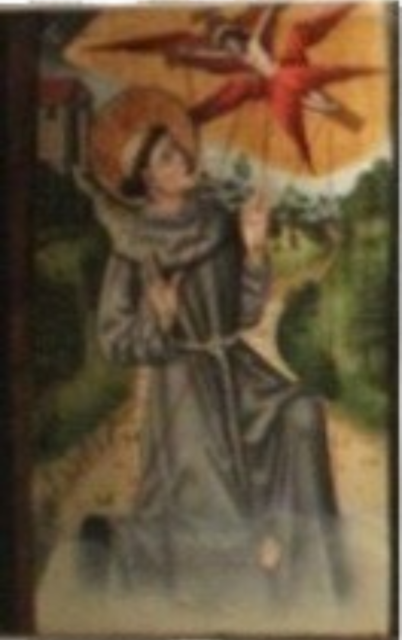 1º izquierda: San Francisco y Santos Antonio Los dos santos cubiertos con sayales, San Francisco recibiendo los estigmas, y San Antonio con un donante.