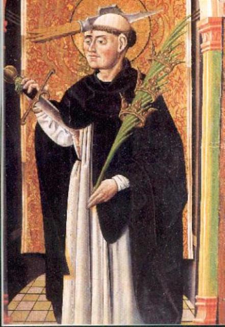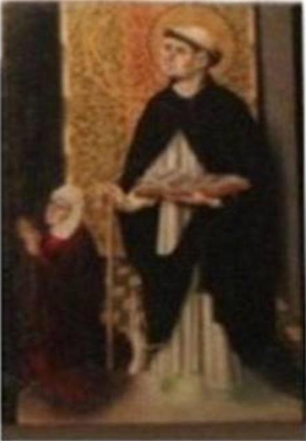 3º Santo Domingo de Guzmán y San Pedro de Verona Santo Domingo de Guzmán, con el tradicional libro y el ramo con alusión a la pureza, cubiertos con túnica y mantos, y junto con una donante María Fernández los santos cubiertos con túnica y mantos y San Pedro de Verona, mártir, con herida en la cabeza y espada clavada.