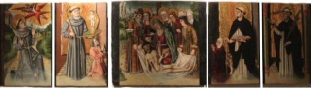 Autor del Retablo de San Antonio Abad el “Maestro de Villafáfila” Para denominar al autor anónimo de las pinturas pertenecientes al retablo dedicado a San Antonio Abad realizado para una capilla de la iglesia de Santa María de Villafáfila (Zamora), al que se le ha denominado “Maestro de Villafáfila” este nombre fue propuesto por D. Manuel la Granja Alonso a la pos de un pequeño estudio por su parte “El carácter dramático y caricaturesco en la pintura hispano-flamenca (siglos XV-XVI): Las tentaciones de San Antonio Abad del Maestro de Villafáfila en el Museo de la Catedral de Astorga” [10]. D. Jesús Cuesta Salado en su trabajo “Pintores Hispanos-Flamencos en el nordeste de la provincia de Zamora”[11], hace referencia así denominado Maestro de Villafáfila, por tratarse de un conjunto uniforme, con un número suficiente de pinturas, de estilo unitario, y cuyo autor es un pintor anónimo, considero correcta la denominación de “Maestro de Villafáfila” al proceder de este lugar el mayor conjunto de pinturas conocidas de este pintor, si bien no son las únicas, pues hubo otras debidas al mismo maestro en Villalobos (Zamora), y otra que se conserva en Benavente. Dos décadas más tarde Post[12] vio en esa ciudad algunas tablas, no todas, expuestas en el museo catedralicio. En la actualidad se exponen juntas en una misma sala, la del Obispo Castellfort[13]. Post[14] relacionó el estilo de estas pinturas con otras que asignaba a Juan Flamenco y que en la actualidad están catalogadas como obra del “Maestro de Miraflores”. Pueden verse parecidos y coincidencias en la composición y también en algunos tipos humanos, pero el pintor burgalés individualiza más los rostros y cuenta con recursos pictóricos superiores. Las pinturas del Maestro de Villafáfila realizadas en Villafáfila y de Villalobos presentan las mismas características. El estilo del autor no parece haber evolucionado entre la ejecución de unas y otras, así que seguramente se realizaron en fechas cercanas. D. Manuel Gómez Moreno[15] aún pudo ver las pinturas en el lugar para el que fueron hechas, aunque al publicarse el Catálogo Monumental de la provincia de Zamora ya anunció su traslado a Astorga, más adelante daremos detalle de ello. Retablo de San Antonio Abad del “Maestro de Villafáfila” que fueron vendidas al Obispado de Astorga en 1908, se encuentra en el Museo del obispado, juntas en una misma sala, la del Obispo Castellfort[16]. Retablo de San Antonio Abad: Vida, tentaciones, tormentos y muerte. El retablo de estilo gótico-hispano-flamenco, finales del siglo XV, o principios del XVI, autor Maestro de Villafáfila. Retablo formado por siete tablas pintadas al óleo: tres de predela o banco y cuatro de cuerpo. Tres tablas de predela o banco Las tres tablas, hoy sin marco, iban colocadas de prelada o banco del retablo original de izquierda a derecha son a cada lado una pareja de santos y en el centro 1º izquierda: San Francisco y San Antonio. 2º centro: La piedad[17] o Llanto sobre Cristo muerto[18]. 3º derecha: Santo Domingo de Guzmán y San Pedro de Verona. Con sus nombres grabados en el oro de los nimbos, el fondo de las tablas imitaba brocados. Las escenas resultan, a juicio de Manuel Gómez Moreno: “inocentes en su composición, duras y sombrías de tono, sin ambiente ni arreglada perspectiva, rostros feos y de expresión torpe y grotesca”. Los personajes arrodillados donde aparece un varón orante con ropilla roja, y una señora” junto a los santos San Antonio y Santo Domingo de Guzmán, pintados a escala mucho menor, representan a los donantes y patronos del retablo comitentes del retablo Fernando Fernández y su mujer María Fernández esta última fue posteriormente fundadora de la capellanía, según costumbre de la época y religiosidad castellana.