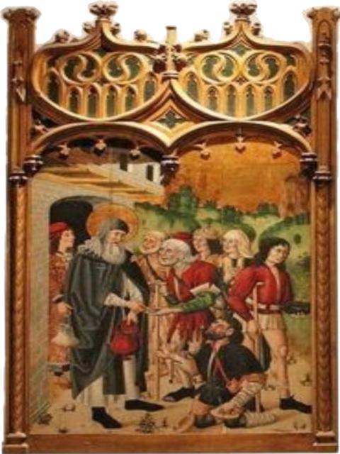 Cuatro tablas de cuerpo Las cuatro mayores representan a San Antonio repartiendo limosna, las tentaciones del santo, con su tortura y apaleamiento por los demonios y su entierro. Miden 100 x 80 cm. y se encuentran enmarcadas bajo chambranas góticas. En las tablas del cuerpo, enmarquetadas en madera con estilo gótico, aparece el santo coronado con nimbo dorado, vestimenta con túnica de color claro, escapulario y manto oscuro, que cae en pliegues verticales, excepto cuando la posición del santo lo impide. Son las vestiduras de un ermitaño. No representan perspectiva y para dar la sensación de ésta se acude a la diferente posición de los personajes que en las tablas intervienen; por ello, el santo siempre va colocado en primer lugar. En tres de sus cuatro cuadros se pintan sencillas iglesias góticas, con puertas y ventanas bajo arco conopial y espadaña con campana. El resto del paisaje es muy simple: simulación de arboledas y espacios rocosos, por ejemplo, para sin individualizar sus componentes. Sus figuras, en algunas tablas muestran malformaciones y rostros feos con expresiones toscas y grotescas, inocentes en sus composiciones, pero duras. I VIDA Representa al santo dando limosna a diversos personajes: cojos y tullidos, que se apoyan en muletas yacen en el suelo. En disconformidad, los rostros de estos son normales e igualmente sus vestiduras. En el fondo aparece la puerta de un aposento elevado, seguido de una arboleda oscura. La escena representa la vida del santo dedicada al socorro de los necesitados.